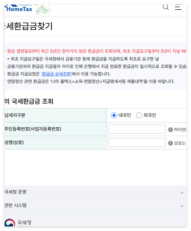 - 홈택스 앱 실행 후 [환급금 조회] 메뉴 클릭